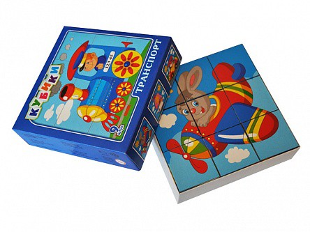 Набор представляет собой комплект кубиков с изображениями фрагментов различных транспортных средств, каждое из которых состоит из девяти кубиков. Набор кубиков предназначен для ознакомления детей от 1 до 5 лет с такими транспортными средствами, как автомобиль, троллейбус, парусник, паровоз, автобус и самолет, а также для развития логического мышления, сосредоточенности, внимания и мелкой моторики рук.