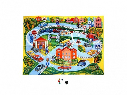 Настольная игра представляет собой игровое поле, на котором изображена демонстрационная схема дорожного движения города с дорожными знаками и объектами социальной инфраструктуры, с набором разноцветных фишек и игральным кубиком.