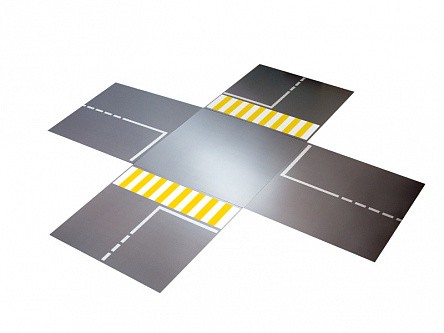 Четырехсторонний перекресток представляет собой демонстрационную модель перекрестка, состоящую из пяти секций, на которых изображена проезжая часть с линиями дорожной разметки и пешеходными переходами.