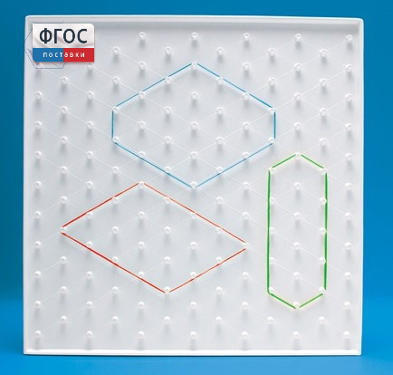 Игровое поле геоборда – пластиковый планшет с выступающими колышками, расположенными с одинаковыми промежутками по горизонтали и вертикали, за которые можно цеплять входящие в набор резинки и «рисовать» геометрические фигуры. Сетка колышков с промежутками в 2 см с обоих сторон игрового поля.