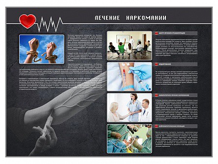 Стенд предназначен для наглядного отображения информации о методах, применяемых для лечения наркотической зависимости.