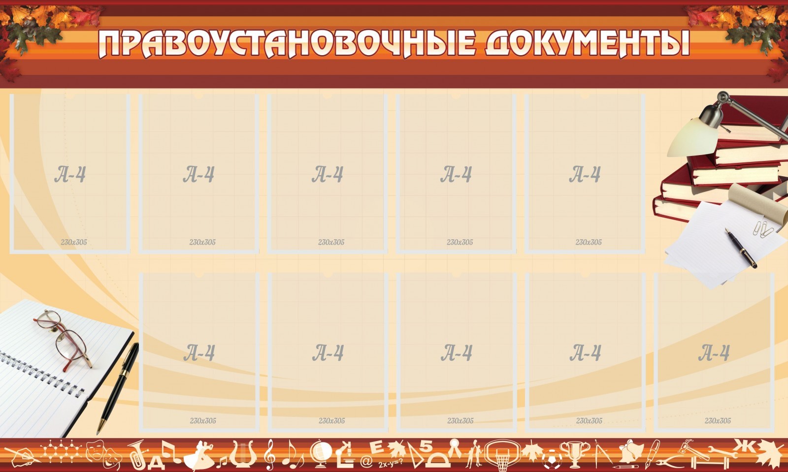 Как и любое другое учебное заведение, школа проходит проверку, для этого предполагается предъявление документов. Теперь их гордо можно вывесить на отдельном стенде «Правоустанавливающие документы». Такой стенд имеет 10 удобных карманов формата А4, в которые можно поместить разрешения из различных инстанций, а также документы из Министерства образования. Каждый документ будет надежно защищен ламинирующей пленкой, а легкий вес стенда позволит без труда его транспортировать. Красивый бардовый цвет стенда с различными оттенками и изображение книг и тетрадей делает его более оригинальным.