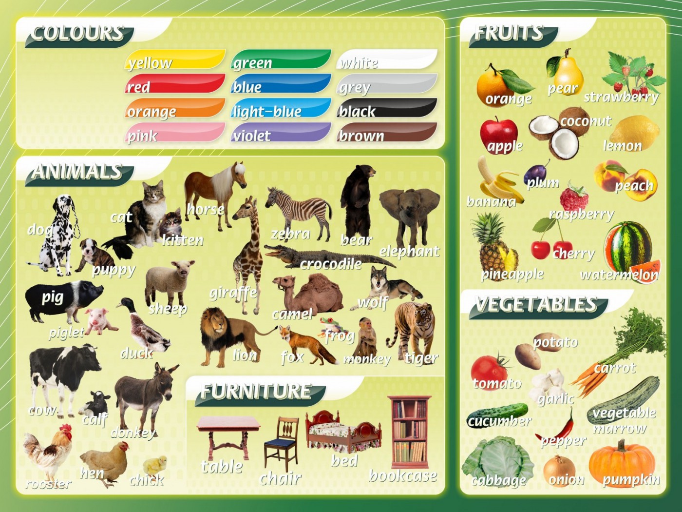 Зачастую у учеников бывает маленький словарный запас, что в большинстве случаев и мешает им в дальнейшем свободно разговаривать на иностранном языке. Простая зубрежка не поможет детям запомнить слова на долгое время. Данный стенд может заинтересовать юную аудиторию, чтобы изучение новых слов для них стало чем-то интересным, увлекающим и занимающим. Дети перестанут путать цвета, животных, фрукты и овощи. Яркие картинки с подписями будут радовать не только учеников, но и учителей, делая уроки более интересными и увлекающими. А ПВХ- пластик, пленка с фотопечатью и ламинирующая пленка сделают стенд долгосрочным.