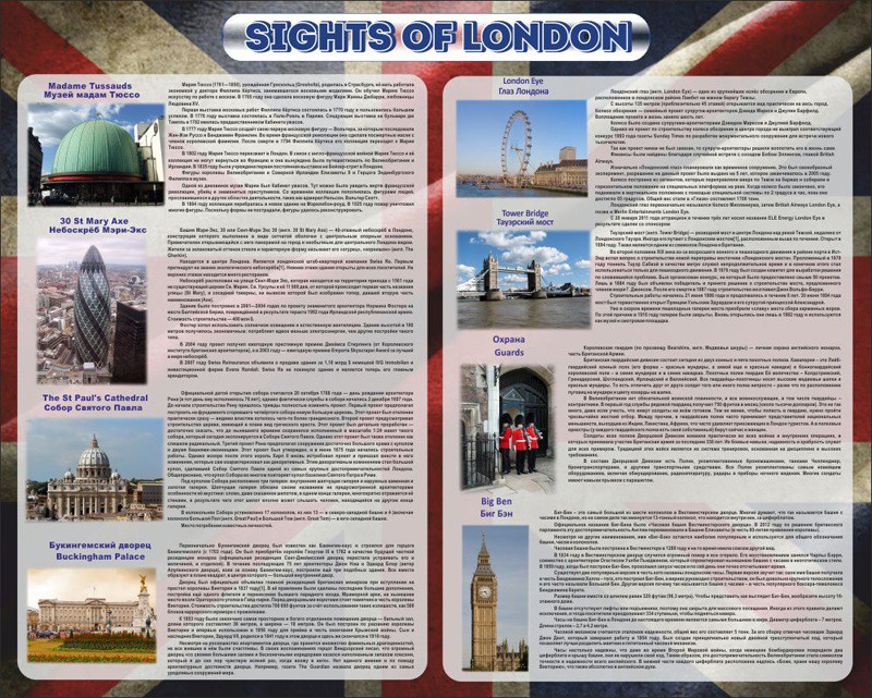 Информация расположена на фоне в виде флага Великобритании. Четкий и понятный шрифт совместно с интереснейшими фотографиями не оставят равнодушными даже самых требовательных учеников. Благодаря этому стенду можно хорошо повысить уровень знаний учащихся об истории основных достопримечательности столицы Великобритании. Великолепное качество наглядного пособия позволит пользоваться ним в течение долгих учебных лет.