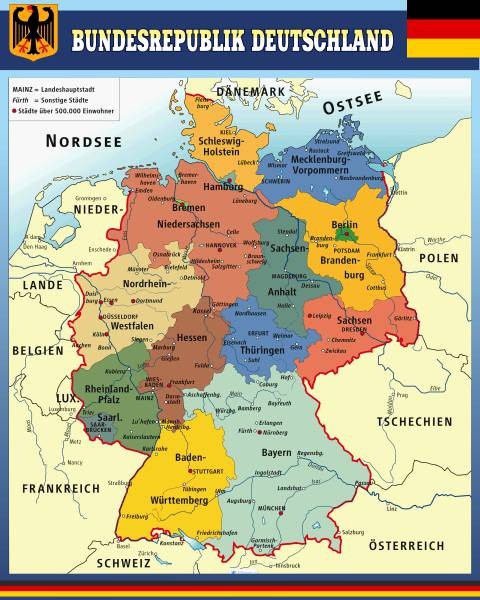 Яркая карта с изображением германских Республик, дана на этом стенде. Безусловно, при изучении каждого языка, необходимо знать намного больше о стране, в которой говорят на этом языке. Возможно, даже больше, чем знают все знакомые и родственники. Так что такой стенд станет прекрасным дополнением к голым стенам кабинета по немецкому языку. Ведь мало знать алфавит и звуки правильного произношения. Нужно увлекаться историей страны, ее географией, и прочими моментами. Прекрасный стенд как раз-таки вызовет интерес, со стороны участников. Благодаря данной заинтересованности, они обязательно узнают больше о чудесной стране, язык которой, они изучают.