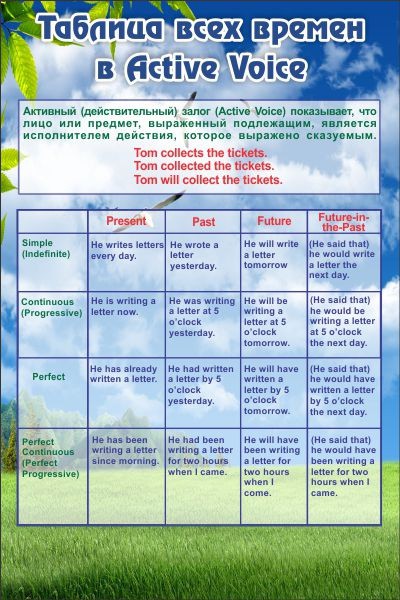 Большинство людей, когда начинают изучение английского языка, путаются во временах. Так как в английском языке шестнадцать времен, каждое из которых имеет свое правило, свое исключение, свои сигнальные слова. В данной таблице ученик сможет увидеть примеры для каждого из времен, что поможет ему побыстрее разобраться со временами и понять, в каких случаях употреблять глагол в том или ином времени. Так же на стенде присутствует информация о активном залоге, прилагая к нему примеры. Спокойный и умиротворяющий фон данного стенда настраивает учеников на учебу. Стенд сделан из высококачественного материала, он прослужит долгие годы.