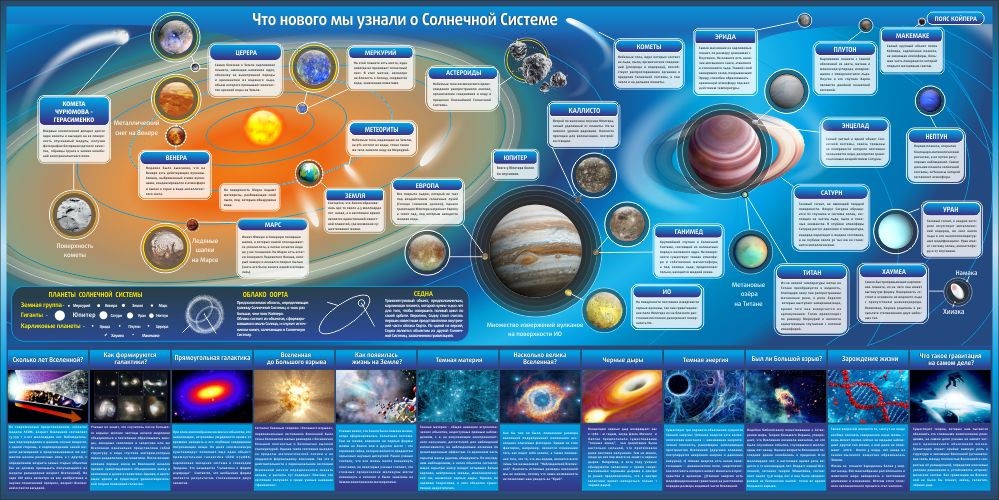 А ещё определение понятий астероиды, Чёрные дыры, Тёмная материя и не только. Если Вы искали по-настоящему интересную наглядность для кабинета астрономии, обратите внимание на широкоформатный настенный стенд о нашей Солнечной Системе. Это увлекательный, очень интересный наглядный материал, благодаря которому школьники быстро и просто расширят свои представления о законах нашей Солнечной Системы, о ее составе,  рассмотрят наглядные примеры.