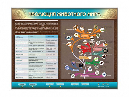 Интерактивный электрифицированный стенд "Эволюция животного мира" представляет собой полноцветную панель с раздельной световой индикацией, на которой изображены основные этапы эволюции животного мира. В конструкции учебного оборудования интегрированы высокочувствительные сенсоры для управления стендом при помощи интерактивного воздействия приемо-передающих устройств. Предусмотрено два режима работы со стендом: "Обучение" и "Контроль".