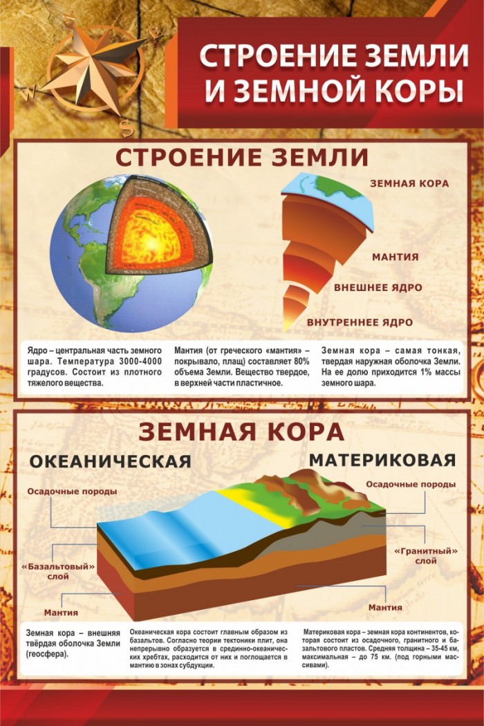 Удобный стенд для изучения земной коры и строения Земли. На нем представлены три изображения: Земли в разрезе, куска Земли и земной коры. Большой плюс данного стенда в том, что на нем не только подписан каждый слой, но и есть определения трудных и непонятных для учеников слов. Изображение земной коры разделено на два: океаническое и материковое строение. Качество стенда на высоком уровне. ПВХ- пластик, пленка с фотопечатью, и ламинирующая пленка сделают стенд долгосрочным, сохранив его первоначальное состояние на долгое время. Краска не поблекнет и не потускнеет. А приятный фон будет радовать глаз учителю долгое время.