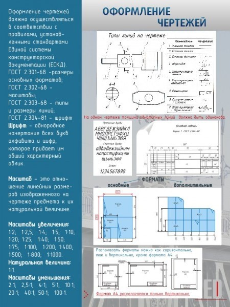 Чтобы у учеников не возникало лишних вопросов по поводу оформления чертежей, этот стенд все подробно рассказывает об этом. На нем указанны все нюансы и мелкие детали, которые просто необходимы для оформления чертежей. Ярко-синяя надпись "оформление чертежей" не останется незамеченной. Качество стенда на очень высоком уровне. ПВХ- пластик, пленка с фотопечатью, и ламинирующая пленка сделают стенд долговечным, сохранив его первоначальное состояние на долгое время. Краска не поблекнет и не потускнеет. А приятный фон будет радовать глаз долгое время. Такой стенд впишется в интерьер любого класса.
