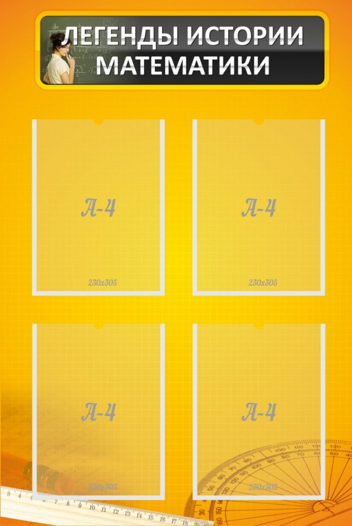 Не пора ли поговорить о знаменитых легендах из истории математики? Ведь эта точная наука, так плотно вошла в жизнь каждого человека во Вселенной, что сложно представить себе планету без математики. Везде нужны расчеты и прочие сведения, которые можно почерпнуть, внимательно и «жадно», изучая эту дисциплину. Так что, хочешь не хочешь, а учить ее нужно. Но вот легенды… Другое дело! Стенд с ними будет интересен любому ученику. А в четырех карманах, учителя могут разместить компактную и увлекательную информацию по теме. К тому же, можно позволить ученикам самим заполнять два из этих карманчиков, за отдельные и приятные отметки, в их дневниках и в учительских журналах.