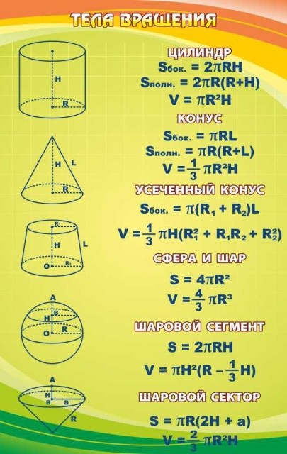 Аккуратное и интересное объяснение, названной темы. Конечно, школьникам сразу не понять всей специфики тематики «Тела вращения», но это не означает, что нельзя попытаться! Наличие подобного стенда в классе, значительно упрощает процесс понимания и запоминания. Яркий дизайн с использованием самых «сочных» оттенков радуги, отлично украсит кабинет математики, помимо основной функции, предлагаемого стенда. Каждому преподавателю будет проще объяснить тему, опираясь на подобного «помощника». Будь то, цилиндр или усеченный конус, на стенде найдется все, что необходимо для работы с учениками и объяснения им обозначенной темы.