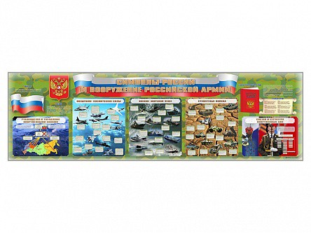 Настенное полотно представляет собой виниловую ткань, на котором размещены символы России и вооружение Российской армии. Настенное полотно предназначено наглядного отображения информации о государственных символах России, видах вооружения, а также для формирования у учащихся или курсантов любви к своей родине и твердой гражданской позиции.