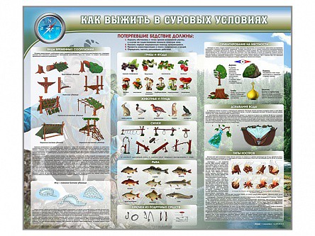 Стенд представляет собой информационную панель, на которой размещены сведения для тех, кто оказался в суровых природных условиях и вынужден бороться за выживание.