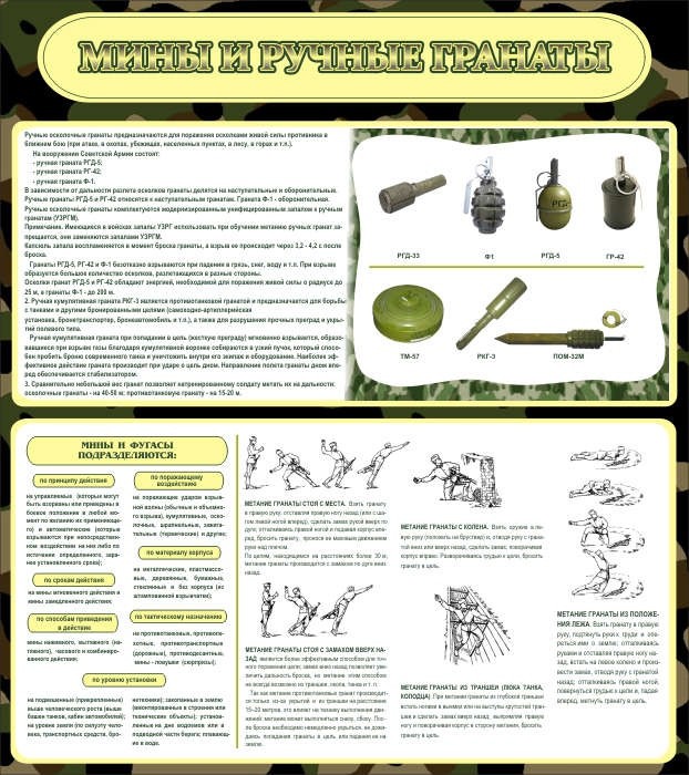 Каждый ученик или курсант военных училищ обязан знать все разновидности мин и гранат. Специально для формирования правильного отношения к военным боеприпасам был выполнен стенд «Мины и ручные гранаты», который отображает в виде красочных картинок различные виды гранат и мин, чем между собой они различаются и как их нужно использовать. А глядя на рисунки с метанием гранат и полным описанием помогает в последствии хорошо разбираться в этом, что очень важно для учащихся. Стенд сделан из высококачественного легкого материала, что позволяет легко монтировать его на любую поверхность.