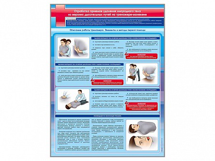 Стенд представляет собой информационную панель, на которой размещены сведения о работе с тренажером-манекеном. Стенд предназначен для наглядного отображения информации о приемах удаления инородного тела из верхних дыхательных путей на тренажере-манекене, а также для формирования у учащихся, курсантов или сотрудников предприятий знаний об оказании первой помощи.