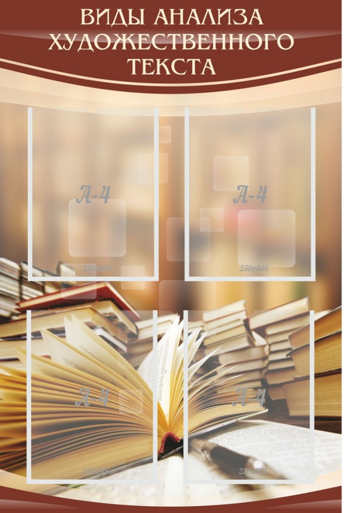 Порой многие школы сталкиваются с такой проблемой, когда ученик не может найти нужную ему информацию в отсутствие учителя, в связи с чем резко падает успеваемость учащихся и общий показатель школы. Стенд «Виды анализа художественного текста» с нанесенным на нем изображением книг отлично подходит под стилистику класса словесности, дополняя его и преображая. Четыре кармана формата А4 позволяют расположить любые подсказки, статьи по данному предмету, а также информацию полезную для учеников школы. Для монтажа на стену такого стенда не требуется особо много усилий и навыков.