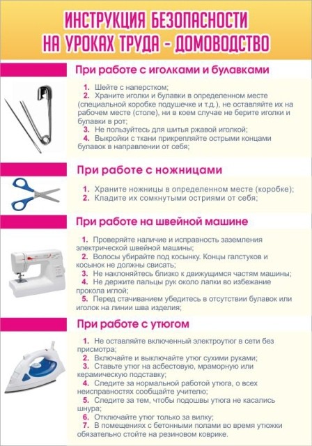 Каждой девочке когда-то предстоит заниматься различными женскими делами, необходимыми для будущей ее жизни. Стенд «Инструкция безопасности на уроках труда» предоставляет все меры предосторожности при работе со швейной машинкой, ножницами, утюгом, иголками и другими предметами, что очень полезно и необходимо знать еще неопытным школьницам во избежание различного рода травм. Стенд выполнен в красочных цветах с небольшими картинками, расположенными с боку, что позволяет хорошо понять всю инструкцию безопасности на уроках труда и оградить себя от порезов и внезапных ран.