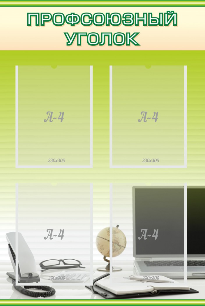 Уникальная модель стенда «профсоюзный уголок» теперь имеет классический дизайн с изображением ежедневника и компьютера. Нежный зеленый цвет и рисунок со стандартным набором для учителя делают стенд спокойным, но в то же время функциональным. Вертикальная форма и четыре кармана для документов формата А4 позволят стенду отлично вписаться в интерьер, а также разместить необходимую информацию. Ламинирующая пленка защити документы от деформации, а наличие открытого уголка позволит легко их заменить. Такой стенд станет не только полезным, но и нужным дополнением учительского кабинета.