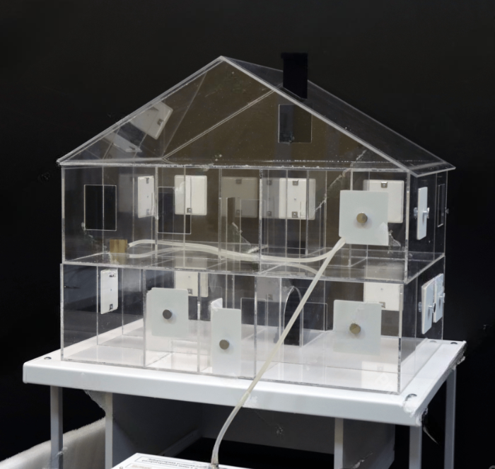Лабораторная установка (далее стенд) предназначена для изучения принципов распространения дыма в жилых помещениях и представляет собой макет дома в масштабе 1:10.