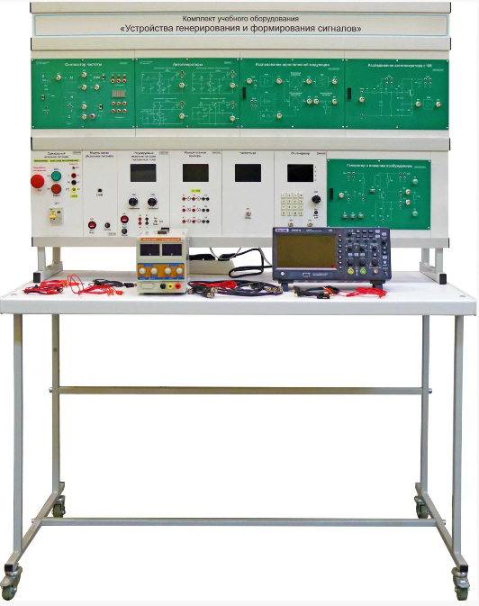 Комплект учебного оборудования «Устройства генерирования и формирования сигналов» выполнен в стендовом исполнении: стойка с модулями установлена на собственном лабораторном столе. Лабораторный стол предназначен для установки стойки с модулями и другого необходимого оборудования. Стойка для установки модулей предназначена для установки и фиксации модулей для проведения лабораторно-практических работ.