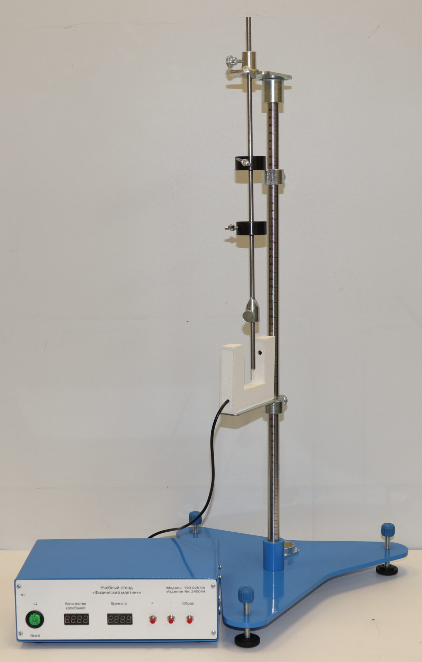 Лабораторная установка представляет собой основание с установленным вертикальным стержнем, на котором закреплен оптический датчик с регулировкой высоты и опорный кронштейн, на который опирается опорная призма физического маятника. Опорный кронштейн свободно перемещается по стержню, что позволяет изменять плечо маятника.