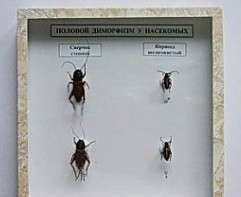 В коллекции представлены насекомые, у которых очень хорошо выражены признаки полового диморфизма, т.е. самки и самцы легко различимы между собой. Диморфизм может быть выражен различными признаками.