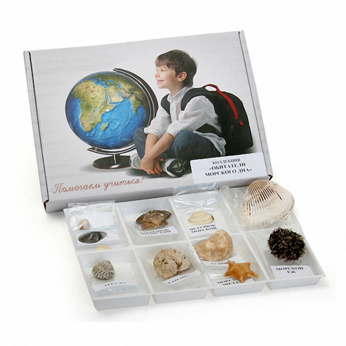 В коллекции представлены биологические объекты, которые можно встретить на морском дне: раковины моллюсков, морской ёж, морская звезда.
