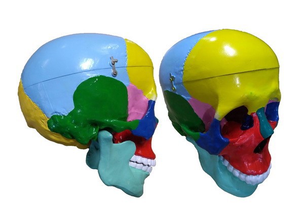 Модель высотой ≈ 16см, изготовлена из пластмассы. Модель позволяет продемонстрировать расположение костей черепа. Отдельные кости выделены различными цветами, что позволяет четко различать их границы.