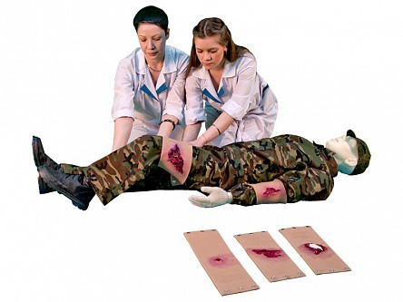 В комплект поставки манекена входят накладные силиконовые травмы и ранения различной степени тяжести с возможностью замены и установки на любую часть тела тренажер-манекена для отработки первичных навыков оказания первой помощи. Установка осуществляется при помощи резинок.